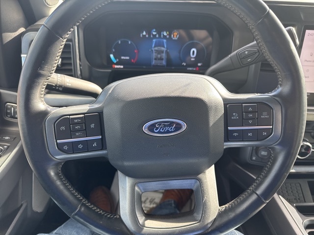 Features include: Black Appearance Package (6" Ebony Black Angular Running Boards, Body Color Front & Rear Bumpers, Ebony Black Painted Front Grille Bars, Ebony Black Painted Mirror Caps, Tough Bed Spray-In Bedliner, and Wheels: 20" Machined & Ebony Black High Gloss), Order Code 618A, 190 Amp Alternator, 4-Wheel Disc Brakes, 8 Speakers, ABS brakes, Adjustable pedals, Air Conditioning, Alloy wheels, AM/FM radio: SiriusXM with 360L, Auto High-beam Headlights, Auto tilt-away steering wheel, Auto-dimming Rear-View mirror, Automatic temperature control, Brake assist, Bumpers: chrome, Compass, Delay-off headlights, Driver door bin, Driver vanity mirror, Dual 68 AH/65 AGM Batteries, Dual front impact airbags, Dual front side impact airbags, Electronic Stability Control, Emergency communication system: SYNC 4 911 Assist, Exterior Parking Camera Rear, Flow-Through Console, Front anti-roll bar, Front Bucket Seats, Front Center Armrest, Front dual zone A/C, Front fog lights, Front Leather-Trimmed 40/Console/40 Seats, Front License Plate Bracket, Front reading lights, Fully automatic headlights, Garage door transmitter, Heated door mirrors, Heated front seats, Heated rear seats, Heated steering wheel, Illuminated entry, Leather steering wheel, Low tire pressure warning, Memory seat, Navigation system: Connected Navigation, Outside temperature display, Overhead airbag, Overhead console, Panic alarm, Passenger door bin, Passenger vanity mirror, Pedal memory, Power door mirrors, Power driver seat, Power passenger seat, Power steering, Power windows, Radio: B&O Sound System by Bang & Olufsen, Rain sensing wipers, Rear reading lights, Rear seat center armrest, Rear step bumper, Rear Wheel Well Liners (Pre-Installed), Rear window defroster, Remote keyless entry, Security system, SiriusXM Radio w/360L, Speed control, Split folding rear seat, Steering wheel memory, Steering wheel mounted audio controls, SYNC 4 w/Enhanced Voice Recognition, Tachometer, Telescoping steering wheel, Tilt steering wheel, Traction control, Trip computer, Turn signal indicator mirrors, Variably intermittent wipers, Ventilated front seats, and Wheels: 18" Bright Machined & Carbonized Gray Alum.