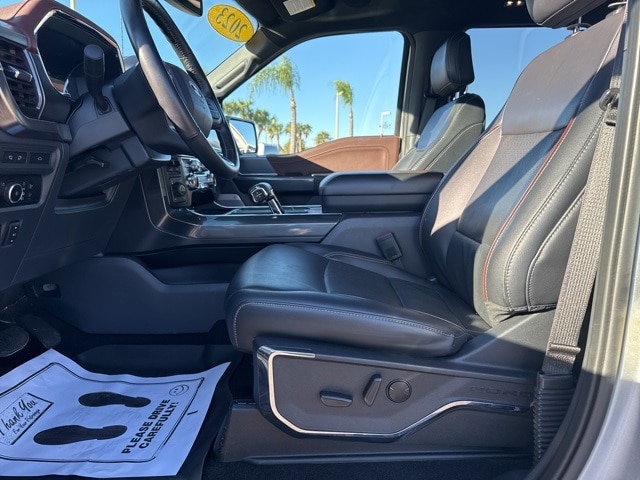 Features include: Bed Utility Package (BoxLink, LED Box Lighting, Power Tailgate, and Tailgate Step w/Tailgate Work Surface), Equipment Group 501A Standard, FX4 Off-Road Package, Lariat Sport Appearance Package (Accent-Color Angular Step Bars, Body-Color Front & Rear Bumpers, Box Side Decals, Chrome Single-Tip Exhaust, and Dark 2-Bar & 1 Minor Bar Style Grille), 4-Wheel Disc Brakes, 8 Speakers, ABS brakes, Adjustable pedals, Air Conditioning, Alloy wheels, AM/FM radio: SiriusXM with 360L, Auto High-beam Headlights, Auto Start-Stop Removal (DISC), Auto-dimming door mirrors, Auto-dimming Rear-View mirror, Automatic temperature control, Brake assist, Bumpers: chrome, Chrome wheels, Class IV Trailer Hitch Receiver, Compass, Delay-off headlights, Driver door bin, Driver vanity mirror, Dual front impact airbags, Dual front side impact airbags, Electronic Stability Control, Emergency communication system: SYNC 4 911 Assist, Extended Range 36 Gallon Fuel Tank, Exterior Parking Camera Rear, Front anti-roll bar, Front Bucket Seats, Front Center Armrest, Front dual zone A/C, Front fog lights, Front reading lights, Front wheel independent suspension, Fully automatic headlights, Garage door transmitter, Heated door mirrors, Heated front seats, Heated steering wheel, Illuminated entry, Inclination/Intrusion Sensor Removal, Integrated Trailer Brake Controller, Leather-Trimmed Bucket Seats, LED Sideview Mirror Spotlights, Low tire pressure warning, Memory seat, Occupant sensing airbag, Outside temperature display, Overhead airbag, Overhead console, Panic alarm, Passenger door bin, Passenger vanity mirror, Pedal memory, Power door mirrors, Power driver seat, Power passenger seat, Power steering, Power windows, Radio data system, Radio: B&O Sound System by Bang & Olufsen, Rear reading lights, Rear seat center armrest, Rear step bumper, Rear window defroster, Remote keyless entry, Security system, Speed control, Speed-sensing steering, Split folding rear seat, Steering Wheel Heat Removal (DISC), Steering wheel mounted audio controls, SYNC 4 w/Enhanced Voice Recognition, Tachometer, Telescoping steering wheel, Tilt steering wheel, Traction control, Tray Style Floor Liner (47W), Trip computer, Turn signal indicator mirrors, Variably intermittent wipers, Ventilated front seats, Voltmeter, Wheels: 18" Chrome-Like PVD, Wheels: 20" 6-Spoke Dark Alloy Painted Aluminum, and Wireless Charging Pad.