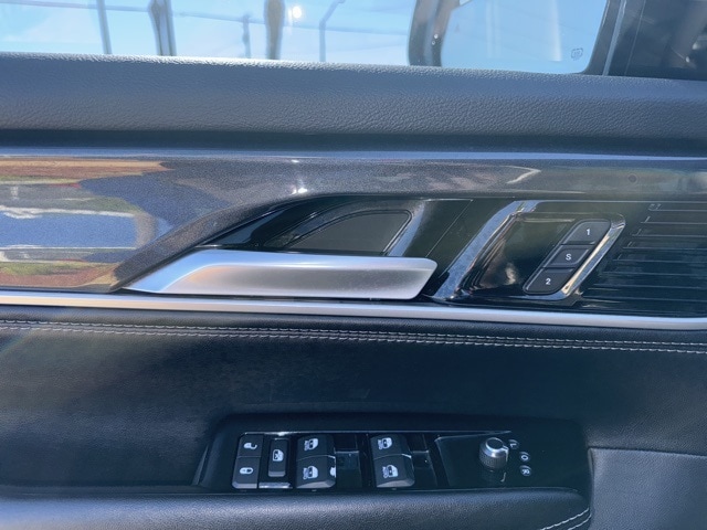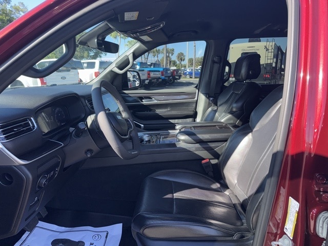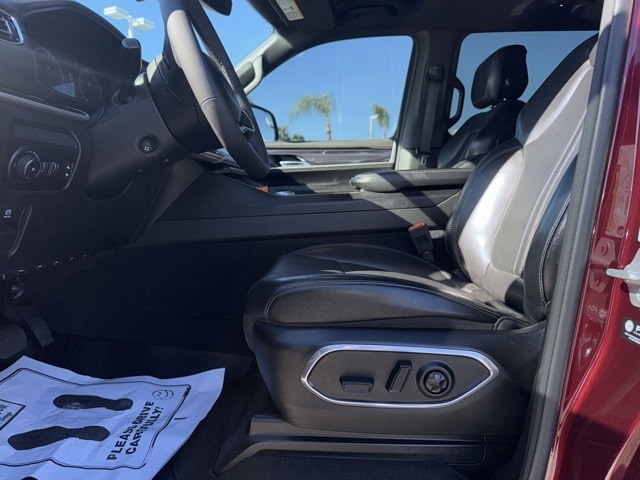 Features include: Quick Order Package 22E (DISC), 10 Speakers, 3.21 Rear Axle Ratio, 3rd row seats: bench, 4-Wheel Disc Brakes, ABS brakes, Adjustable pedals, Air Conditioning, Alloy wheels, AM/FM radio: SiriusXM with 360L, Anti-whiplash front head restraints, Audio memory, Auto-dimming door mirrors, Auto-dimming Rear-View mirror, Auto-leveling suspension, Automatic temperature control, Brake assist, Bumpers: body-color, Compass, Delay-off headlights, Driver door bin, Driver vanity mirror, Driver's Seat Mounted Armrest, Dual front impact airbags, Dual front side impact airbags, Electronic Stability Control, Emergency communication system: Automatic SOS Call, Exterior Parking Camera Rear, Four wheel independent suspension, Front anti-roll bar, Front Bucket Seats, Front Center Armrest w/Storage, Front dual zone A/C, Front fog lights, Front reading lights, Fully automatic headlights, Garage door transmitter, Heated door mirrors, Heated front seats, Heated steering wheel, Illuminated entry, Knee airbag, Leather Trimmed Bucket Seats, Low tire pressure warning, Memory seat, Navigation System, Normal Duty Suspension, Occupant sensing airbag, Outside temperature display, Overhead airbag, Overhead console, Panic alarm, Passenger door bin, Passenger seat mounted armrest, Passenger vanity mirror, Pedal memory, Power adjustable front head restraints, Power door mirrors, Power driver seat, Power Liftgate, Power passenger seat, Power steering, Power windows, Radio data system, Radio: Uconnect 5 Nav w/10.1" Display, Rear air conditioning, Rear anti-roll bar, Rear dual zone A/C, Rear reading lights, Rear seat center armrest, Rear window defroster, Rear window wiper, Reclining 3rd row seat, Remote keyless entry, Security system, Speed control, Speed-sensing steering, Speed-Sensitive Wipers, Split folding rear seat, Steering wheel memory, Steering wheel mounted audio controls, Tachometer, Telescoping steering wheel, Tilt steering wheel, Traction control, Trip computer, Turn signal indicator mirrors, Variably intermittent wipers, Ventilated front seats, Voltmeter, and Wheels: 18" x 8.0" Aluminum Base Finish.